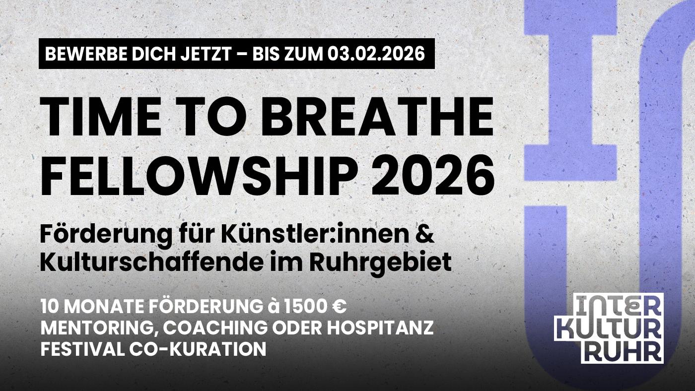 Hier will das Time To Breathe Fellowship die Möglichkeit bieten, die eigene künstlerische Arbeit weiterzuentwickeln und eine nachhaltige Vernetzung und Sichtbarkeit der Fellows im Ruhrgebiet und darüber hinaus zu ermöglichen.